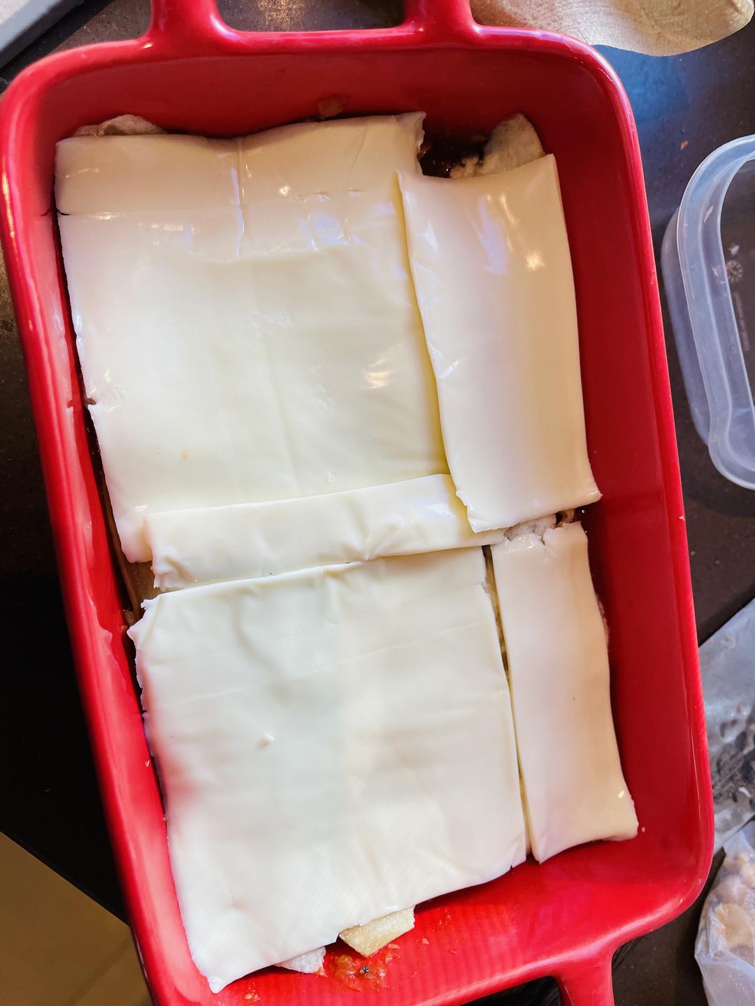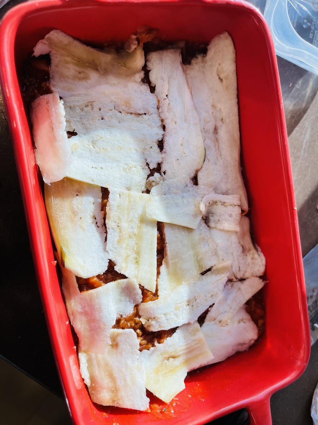 铺上茄子;可以铺一些🍆,因为烤完之后茄子🍆会“融化”然后就找不着了:( 我第一次放茄子做的少,其实茄子很好熟,建议可以多铺几层