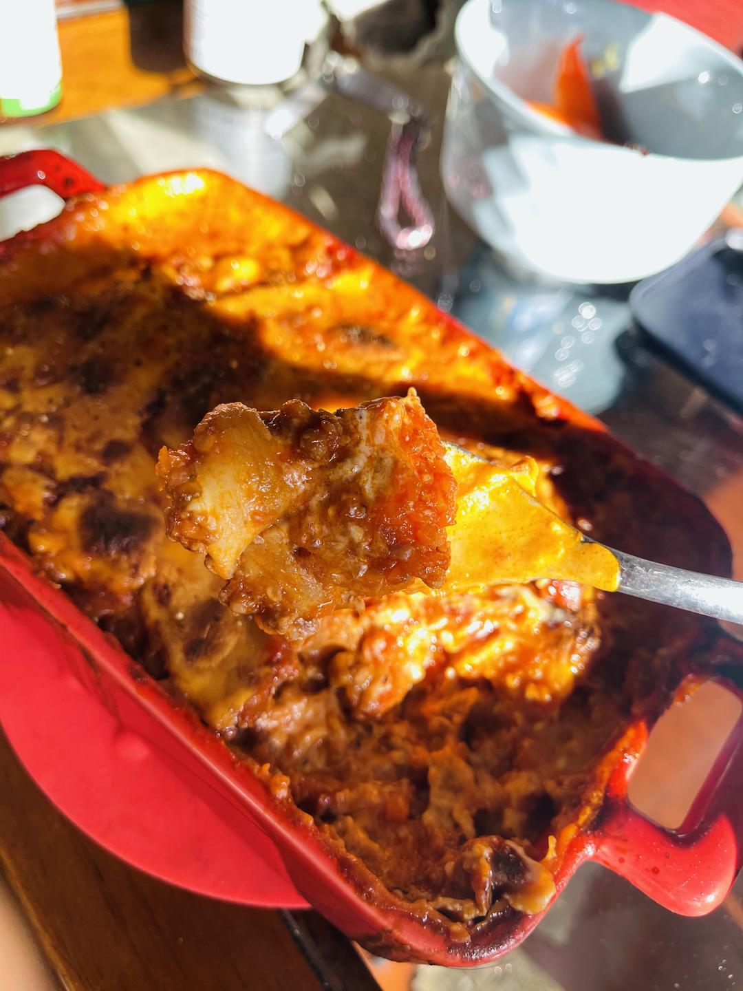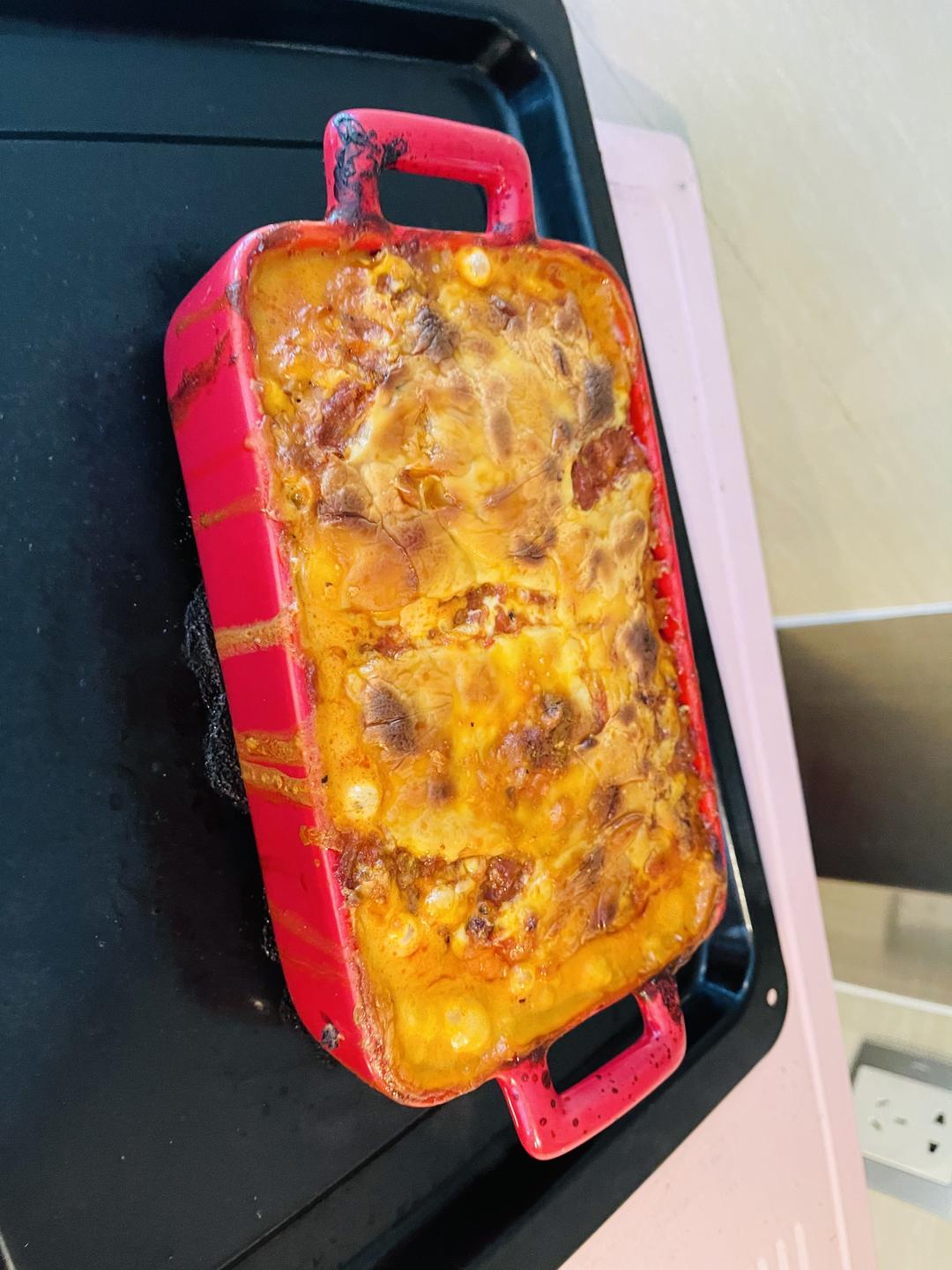 胡萝卜、口磨、牛肉馅儿、番茄酱一起炒熟之后把肉酱弄的干一点,铺好一层
