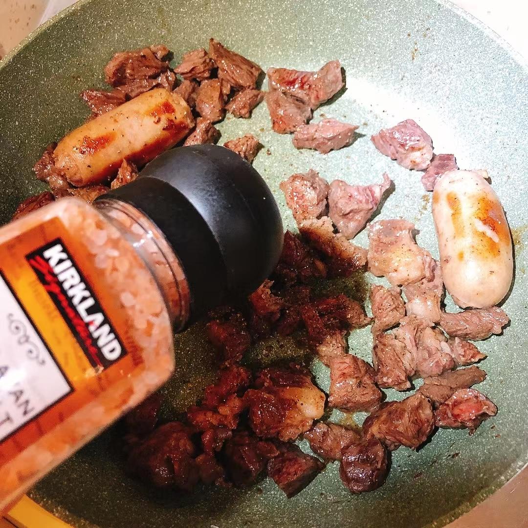 家里有牙齿🦷还没长全长齐的小朋友所以用剪刀✂️把牛排剪成小块之后接着煎。