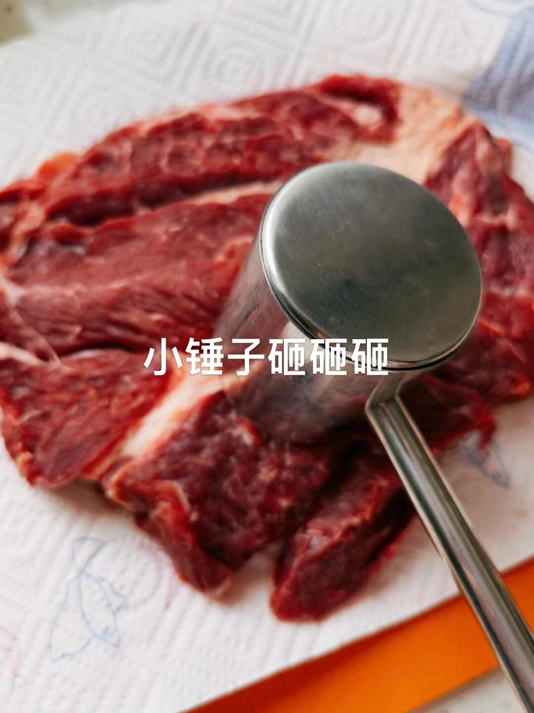 补充说明:牛肉用锤子🔨砸砸砸 在超市买肉的时候,就是要服务员切自己想要的牛排厚度一片。