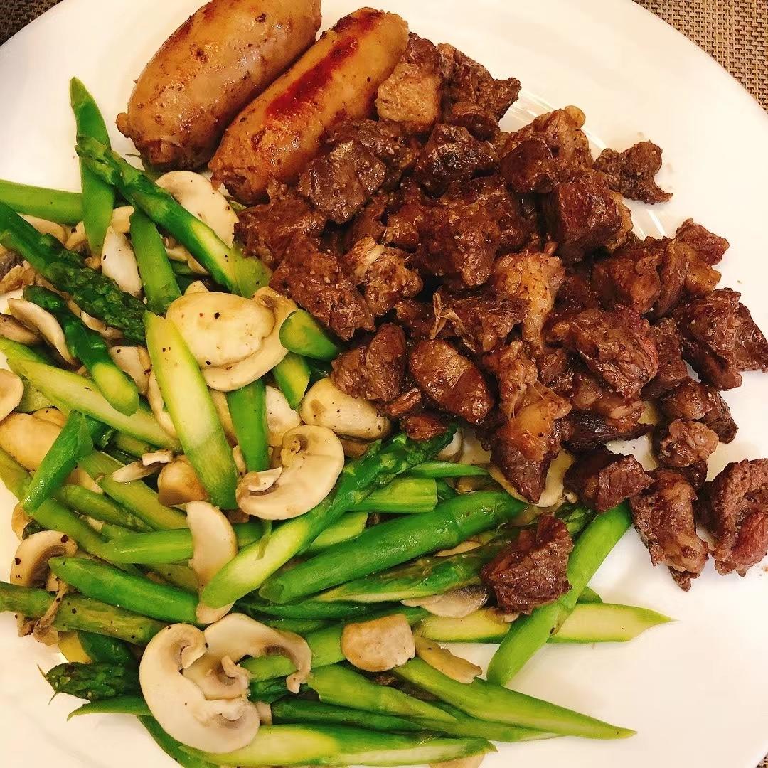 牛排🥩买的肋眼肉,皓月家的牛肉肉质还是不错。 煎之前冲洗干净后用厨房纸吸干净,用砸肉锤敲打牛排🥩(不用太用力),可烹饪的橄榄油煎制两遍金黄(并没有这个颜色,就是表示两边煎熟),然后用夹子夹着然后用剪刀✂️煎成一个一个小块,撒黑胡椒碎粒和盐(我用的喜马拉雅大力粉盐研磨),翻炒一会儿即可出锅,不要时间太久容易硬。口蘑和芦笋是分别用其他两个锅小火烹熟,撒黑胡椒和盐。✌️ 好吃😋