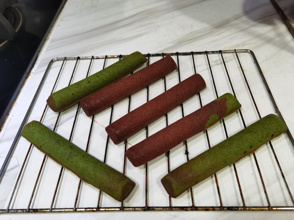 最后大概搅拌成这样,把面糊分成两份,分别加入抹茶粉和可可粉