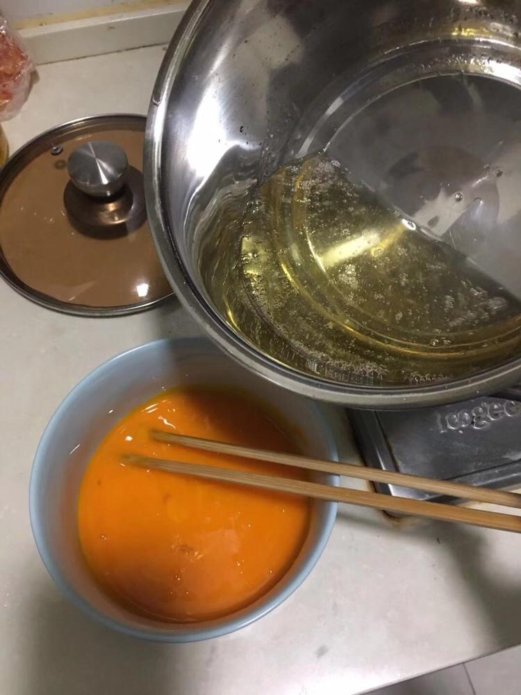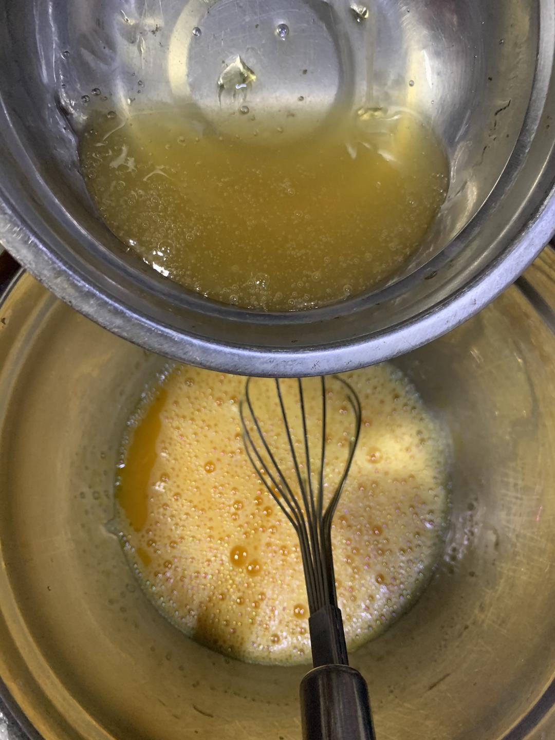 细砂糖加水煮沸慢慢倒入鸡蛋液中,一定要一点一点慢慢到,一边倒一边轻轻搅拌