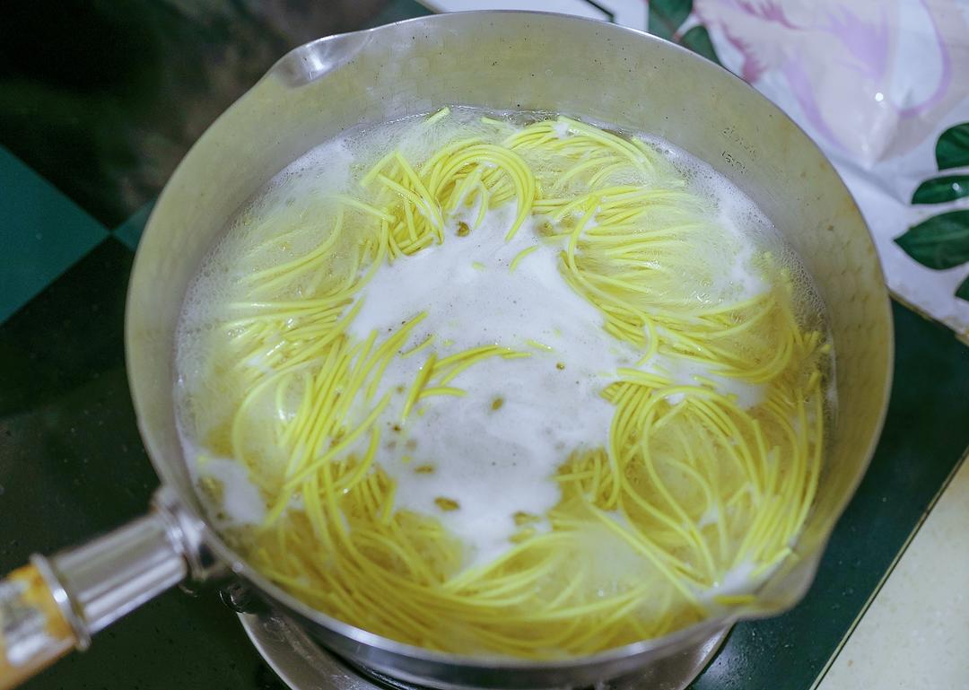 第四步准备再次煮面。 水开,放面煮35秒捞出,煮久了会没有嚼劲。