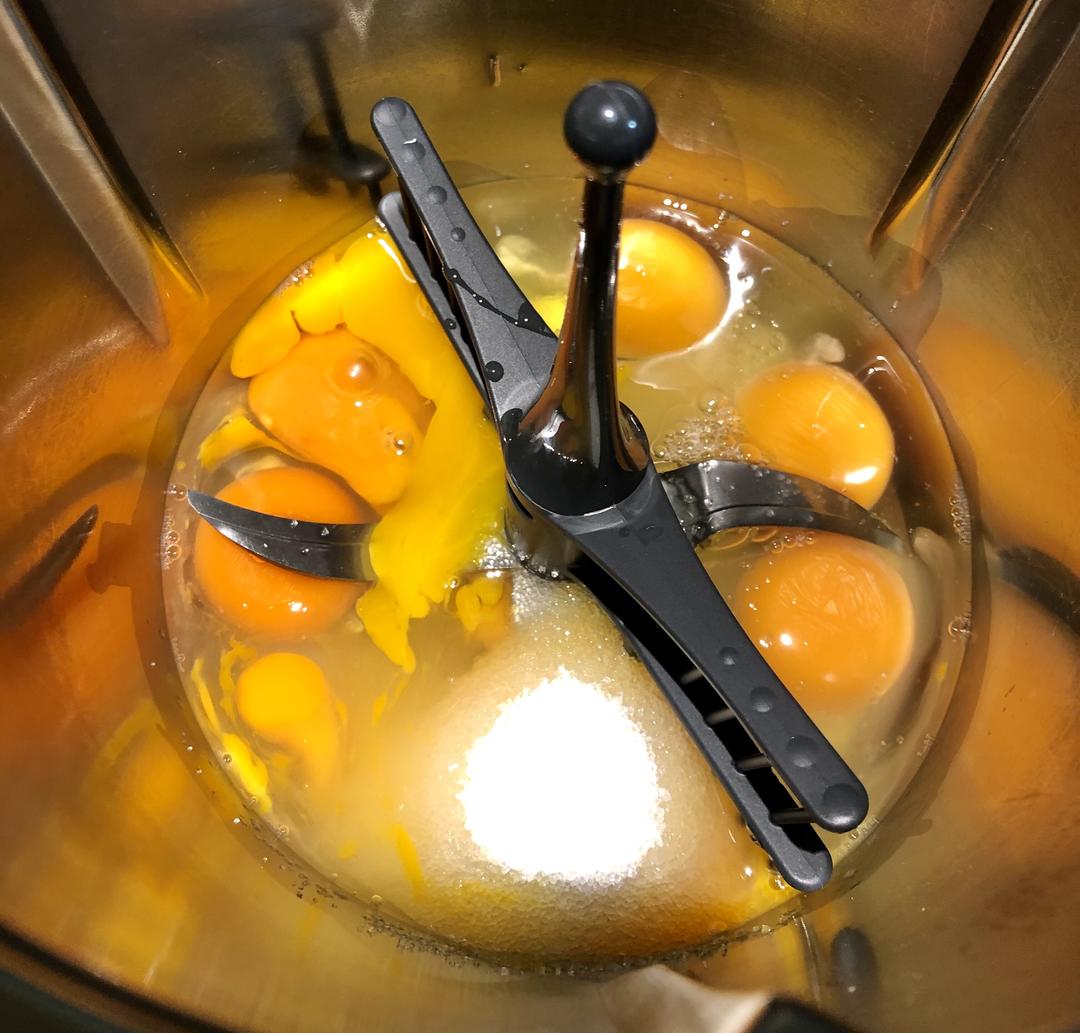 主锅洗净擦干,蝴蝶棒插入刀头中间,轻轻向右扭动往上提,如果能提起来就换一个方位做同样动作,一定要保证蝴蝶棒提不起来。加入6个大鸡蛋(如果小要多加1个),加入70克或者80克细砂糖(随喜好)设制:10分钟/45度/速度4打发。同时预热烤箱22分钟/175度。