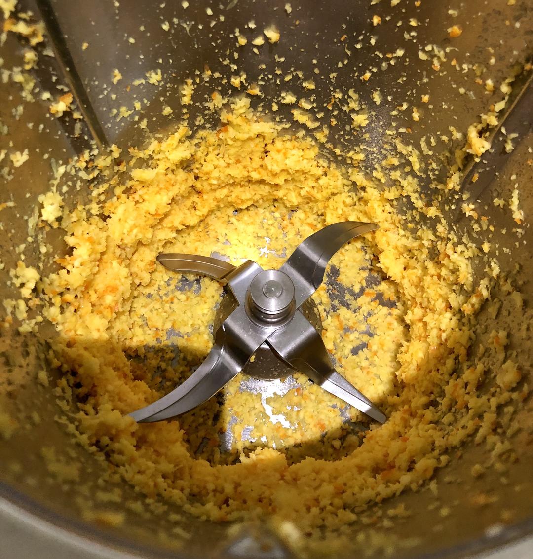 把挤过的橙汁皮(两个半块)放入主锅,设制5秒/速度10打碎,然后把锅壁上的橙皮刮到锅底,再设制5秒/速度10打碎,重复前面动作,最后再设制5秒/速度10磨碎。