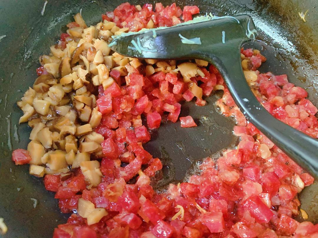 广式腊肠切碎,干冬菇提前泡发,一起炒香。油可以少放,腊肠出油较多。