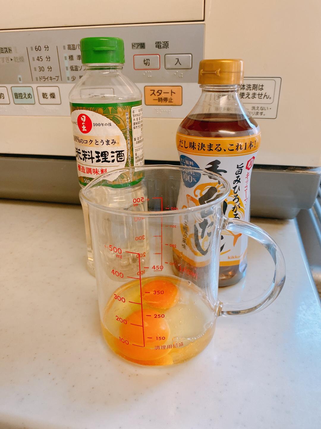 鸡蛋2个,再配上3倍的水,这个比例很好,蒸出来不会太厚或太薄。打散后,配上一点点米酒,我用的高汤2勺是鰹鱼和海带的。放一点点盐