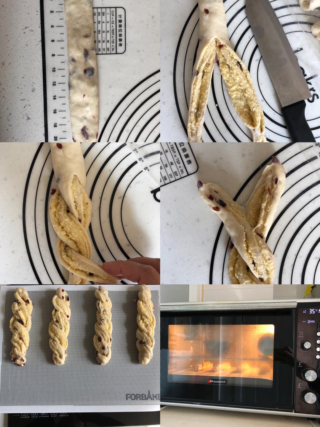 松弛好的面团擀开横过来,抹上椰蓉馅,大概每个30克馅料。卷起来,搓长至22厘米左右,中间切开,编双辫即可。
