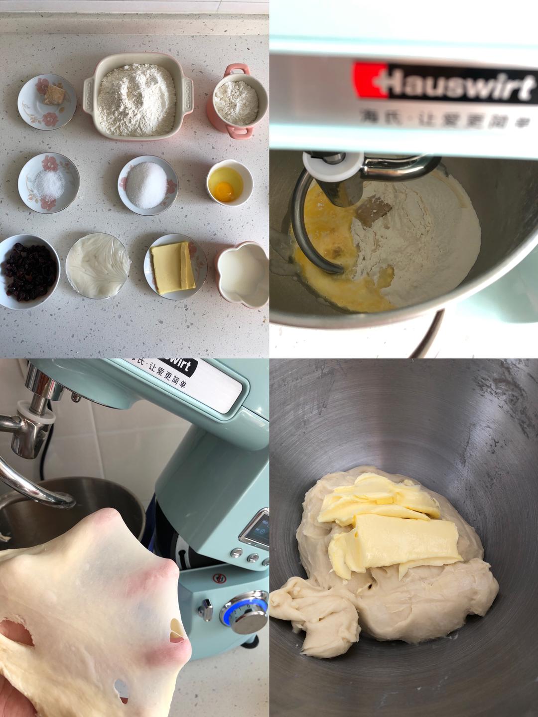 将主面材料除黄油外放入厨师机中,二档成团转4档打出粗膜,加入黄油,二档搅匀后转四档出手套膜