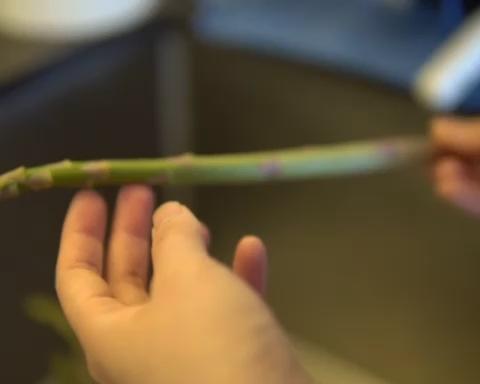 参照图片,两只手拿住一根芦笋,轻轻弯折芦笋的根部,掰断芦笋 掰断的地方就是老和嫩的分界点,这样就可以自然地折掉老的部分,留下嫩的部分 不用削皮,芦笋去掉老根后切段就可以~