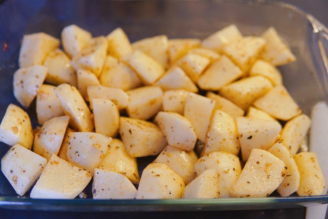 土豆切块(大概4-5cm大小) 可以用小土豆代替,洗干净,对半切开就好,可以保留土豆皮 切好的土豆,沥干擦掉多余水分,放在烤盘里 也可以用铺上烤焙纸或锡纸的烤盘