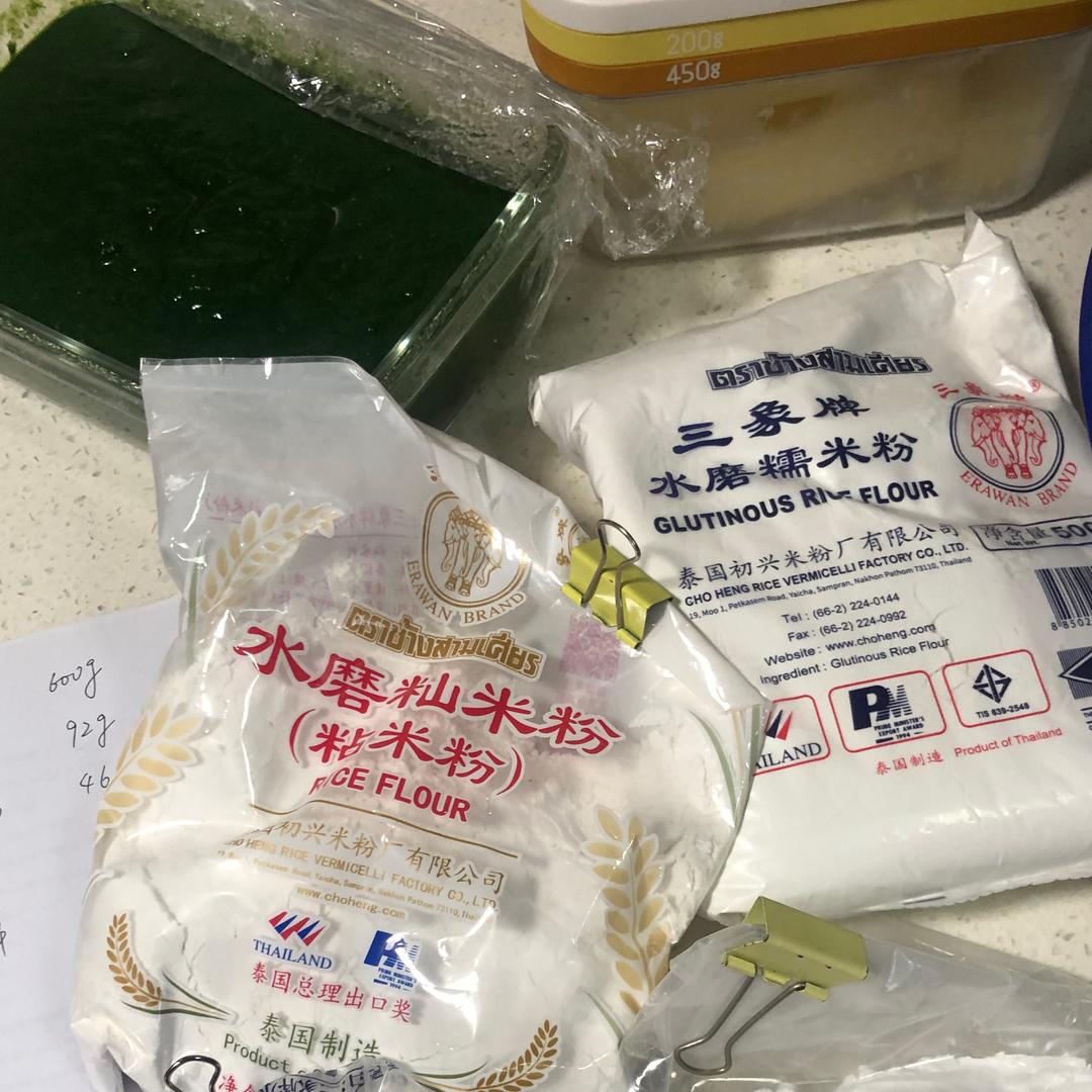 开始做糯米团 将糯米粉,粘米粉,糖粉,黄油,艾草泥放到一个大盆,然后慢慢加入80度的热水,搅拌均匀。