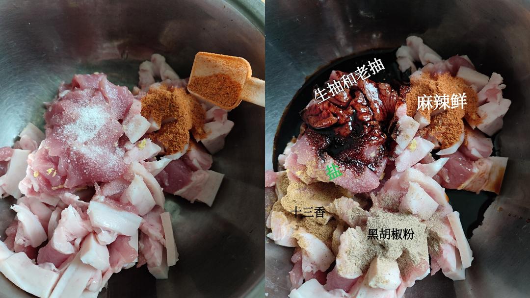 加入半勺盐,一小勺麻辣鲜,半勺十三香,一小勺黑胡椒粉,两大勺的生抽和一勺老抽