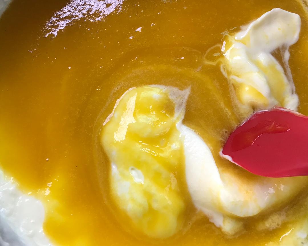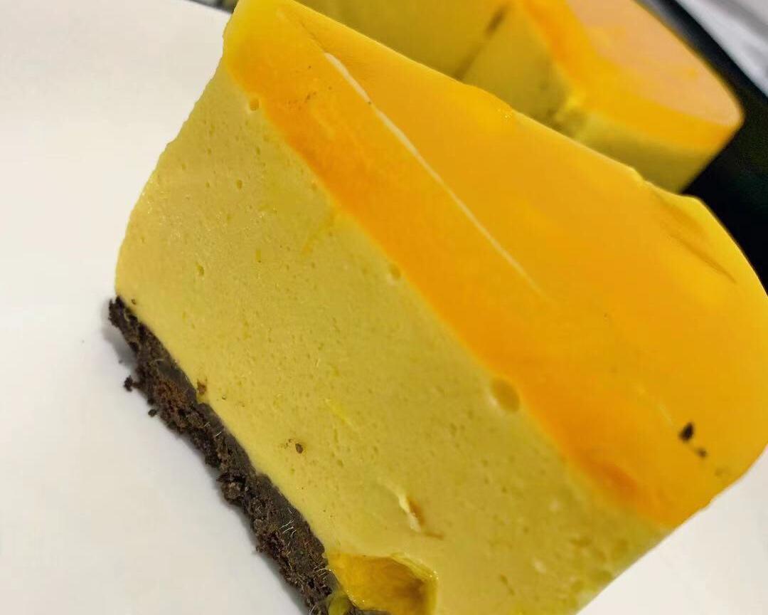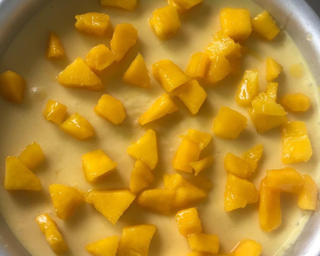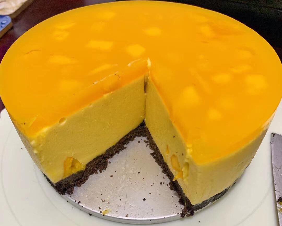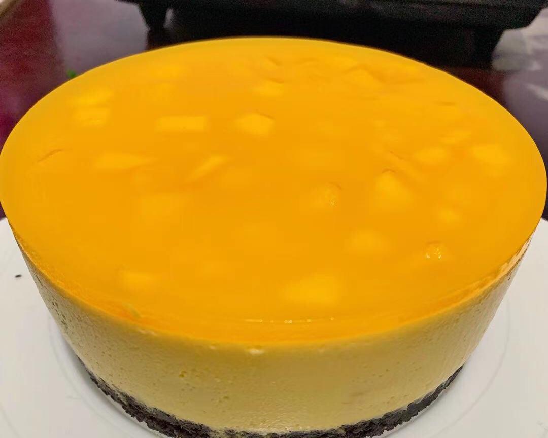 做好的慕斯蛋糕冷藏4小时后取出做面镜,如果着急的,可以冷冻一小时,我是冷冻一小时后做面镜的,取出就把调好面镜的芒果糊倒入慕斯蛋糕模具里,再冷藏4小时就可以吃了