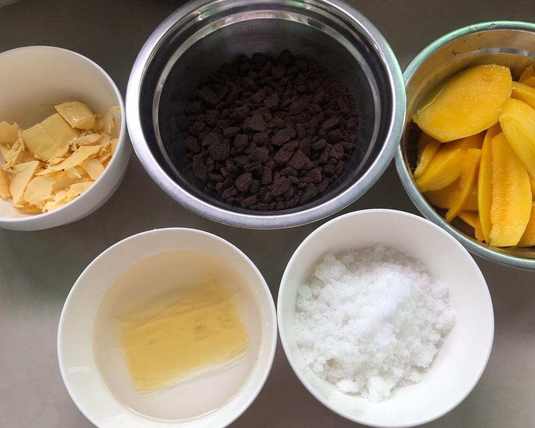 吉利丁片用冷水泡软,芒果230克➕白糖30克放入榨汁机打成芒果泥,小火加热芒果泥50°左右,放吉利丁片进去搅拌融化,不能太过,融化就行