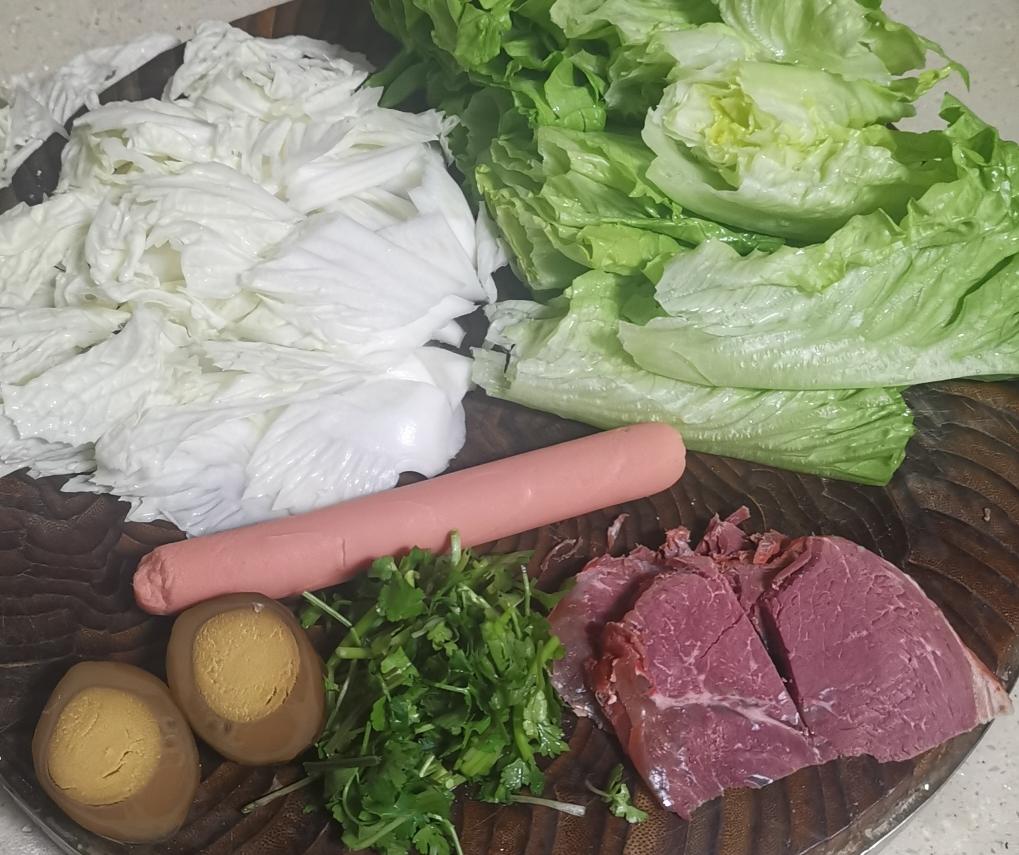 配菜随意,我煮了生菜、白菜、菠菜、香肠、牛肉、鸡蛋,喜欢吃煎蛋也可以放煎蛋