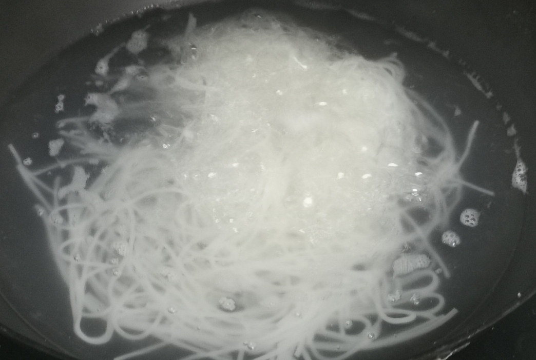 换水,凉水下粉,除青菜以外的配菜 和剩余调料全下,煮开,5分钟