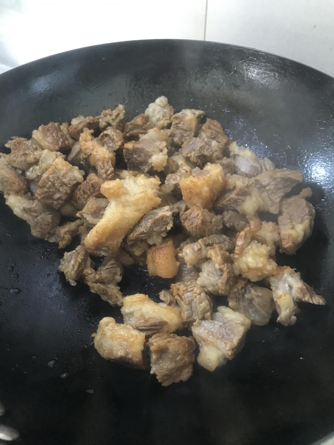 冰糖炒糖色后、把牛肉放进去翻炒均匀