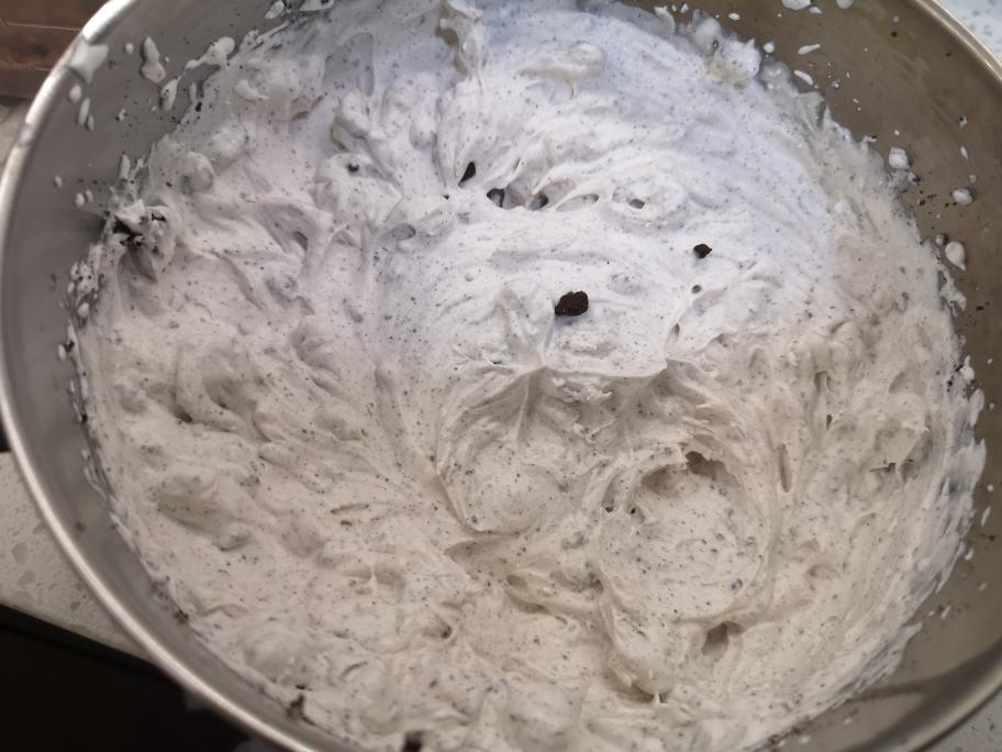 奥利奥碎奶油,如果喜欢口感细腻的,可以提前把奥利奥碎压的细些,奶油袋的口剪的可以小一点,半个CM宽就行。 当然,如果和我一样喜欢有颗粒感的奥利奥碎,就在打奶油时尽量多打一会儿,然后奶油袋口剪的稍大一点,挤的时候点状挤出奶油,再用硅胶板刮薄一些,总之这一步比较随意哈😊,因人而异。尽量薄一些,更健康嘛⚈₃⚈