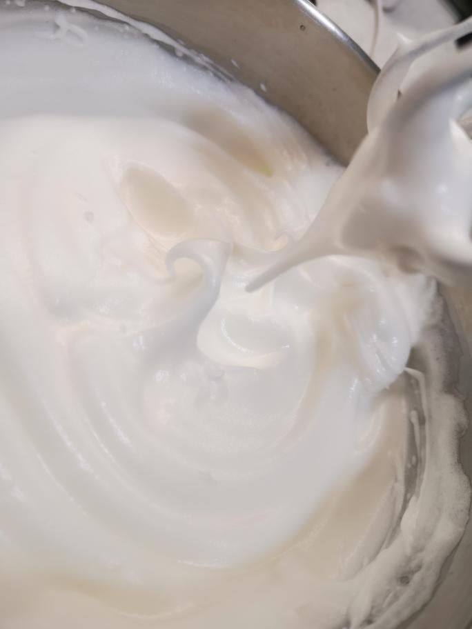 蛋清盆里加入柠檬汁和香草精,柠檬汁可用白醋替代。电动打蛋器搅打过程中,分三次加入细砂糖。蛋清打到提起打蛋器可见蛋清呈小弯钩,👌