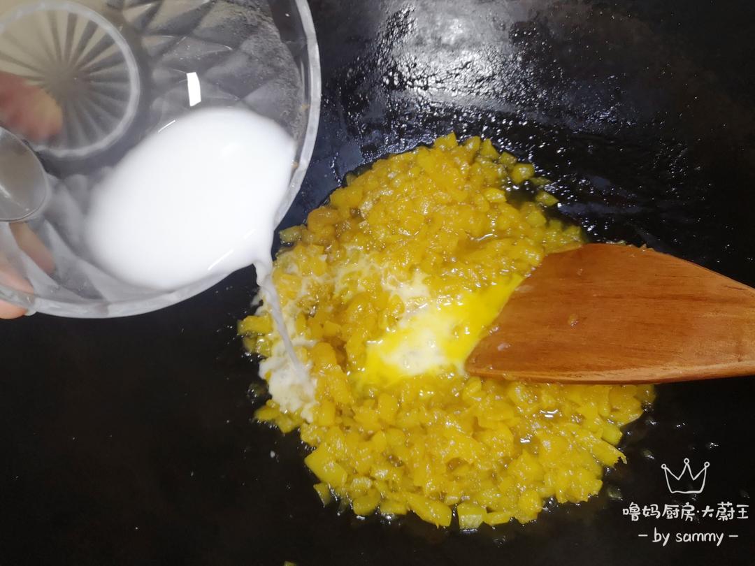 水分基本快熬干了,倒入淀粉水(搅一搅,放久了会沉淀),开大火快速翻炒约半分钟;