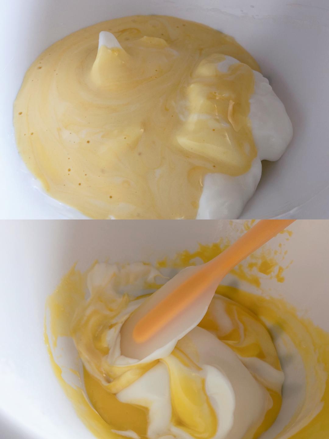 打好的蛋白取1/3加入蛋黄糊中,翻拌均匀,倒回蛋白盆中,翻拌均匀,倒入烤盘里,放入预热好的烤箱。