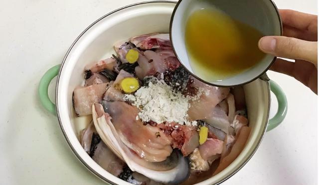 1.准备好食材,这水煮鱼里面用的鱼可以用黑鱼,桂鱼。巴沙鱼,草鱼等等。我这里面用的是花莲。刺也还是很少的。大家也可以买现成的鱼片,把鱼处理干净了以后清洗干净切成小片。水煮鱼的调料我买的就是现成的,里面有腌鱼料包,调料包,干料包,就不用我再准备什么了。 2. 在鱼片里面挤入腌鱼料包,放入姜片还有料酒,用手抓拌均匀,放在一边腌制10分钟左右,腌制好了以后,放入1个蛋清再搅拌均匀。(腌鱼料包:淀粉,食用盐,味精,白胡椒)