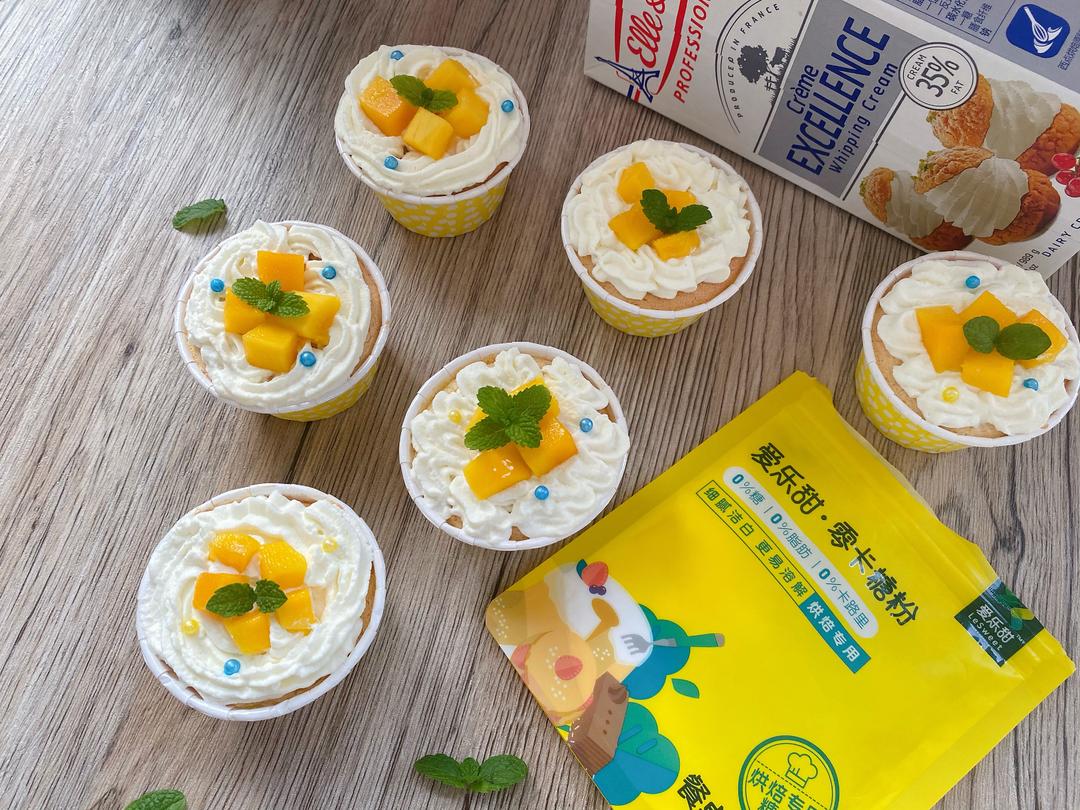 在杯子蛋糕上挤出漂亮的花形,放上喜欢的水果,点缀上小糖珠,最后再放上一片薄荷叶装饰一下,一个好吃又好看的芒果杯子小蛋糕就做好了