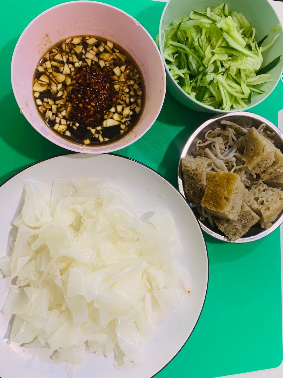 配菜和调料汁拌入切好的凉皮~我开动啦🍝 简单 快手 美味的凉皮30分钟就能搞定🥳