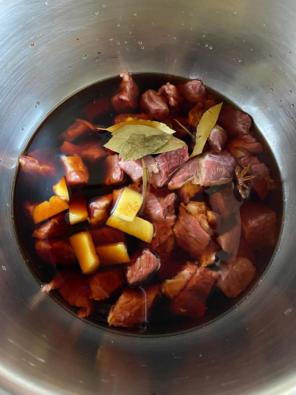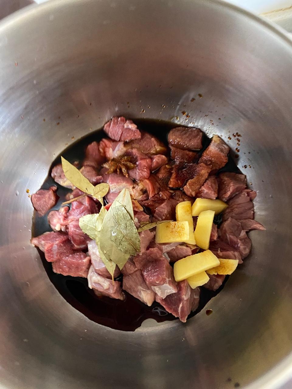 买来的鲜牛腩洗净后切成需要的大小(大概边长1.5cm吧)。我做的三人份的,大概用了350克牛腩。切好后用水泡一会儿,泡出血水。倒掉血水后冲洗一下,放入高压锅,锅中放入姜片、香叶、一两粒八角、一点料酒、生抽、老抽、盐。