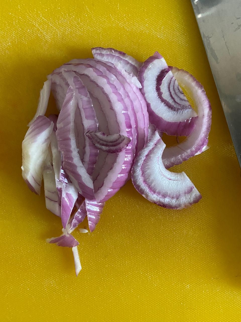一个较大的洋葱用了一半,切成条。准备俩稍大的土豆🥔(忘记拍照)去皮后切,这里可以切成大点的块也可以切成小碎丁(如果你喜欢土豆🥔最后在汤里变成泥状。不过有些土豆品种不容易煮成泥,要看你买的什么品种。不过都好吃😋)