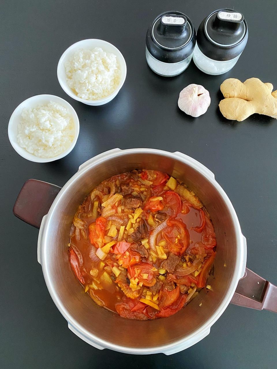 牛腩下气之后开盖把上面准备好的三种蔬菜倒进去,拿勺子翻一下,把肉翻上来,因为压在下面容易烧糊。在锅里适当加入白糖和盐,因为加入了这么多蔬菜,刚才炖肉加的盐肯定不够味儿了。盖上一个跟高压锅锅口差不多大小的锅盖(注意⚠️不是高压锅锅盖!现在把它当普通锅用),炖15分钟左右,炖到西红柿和洋葱全都变软,西红柿🍅汁溶解到汤里,土豆绵软为止。此时尝一下汤味,应该是酸甜味的,如果觉得味道不够,可以适当补充糖和盐,然后搅拌匀,关火。