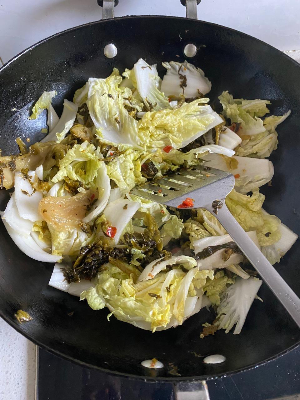 酸菜炒差不多了,备好的娃娃菜也下锅翻炒软。