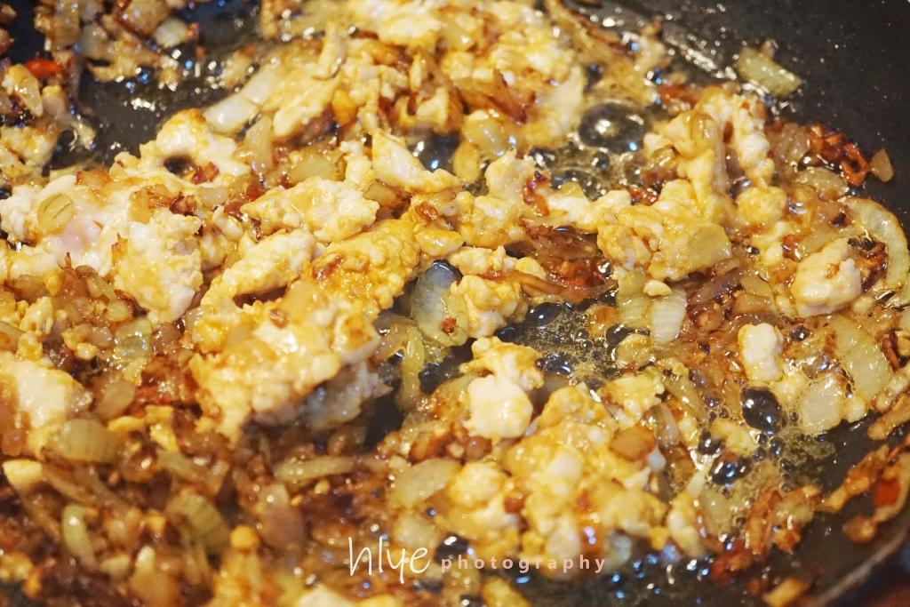 鸡肉碎加入预先拌匀的酱油、糖、盐、咖喱粉腌制。烧热锅子,以4汤匙植物油爆香葱头、蒜头和指天椒后。