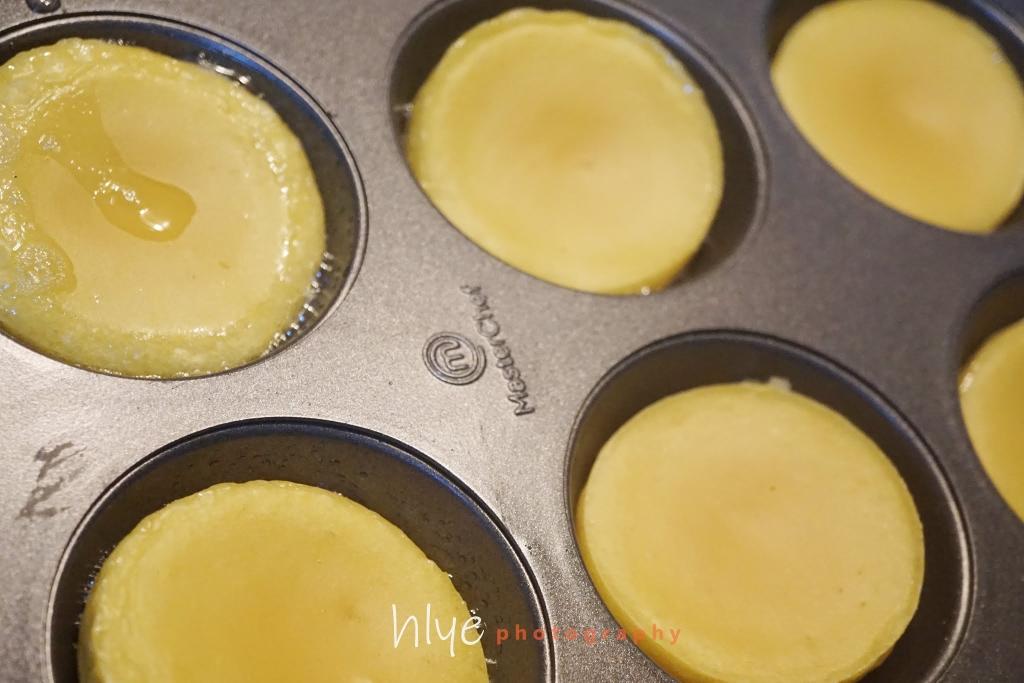 倒入1/3杯面糊(越1.5cm厚),170°C烤10分钟。