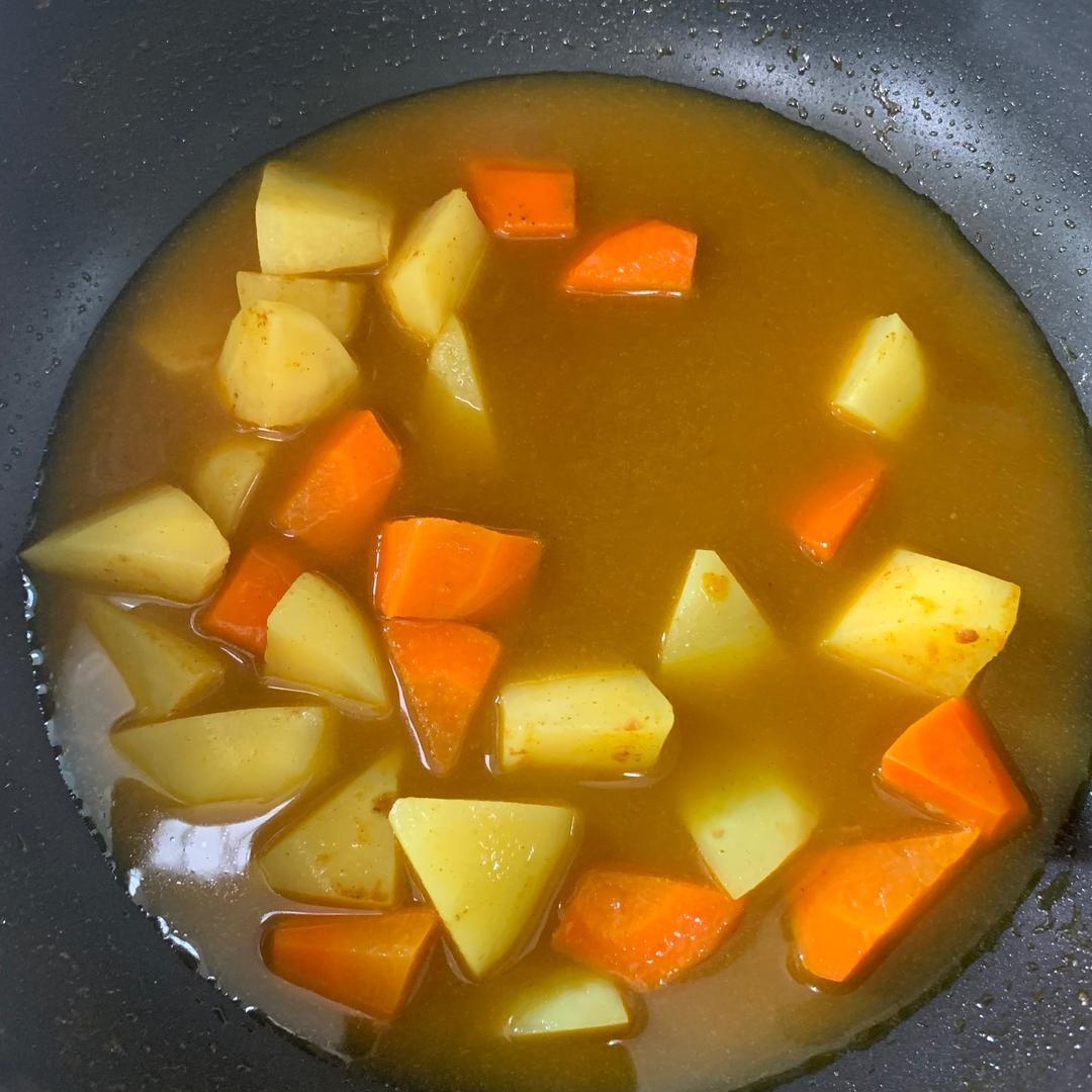 咖喱酱和蔬菜一起炒香后放水,水量没过蔬菜即可,然后等蔬菜煮到七分软后,把鸡腿肉倒进去,再加三勺蜂蜜🍯(注意:这是美味的关键),待土豆跟胡萝卜九分软即可大火收汁