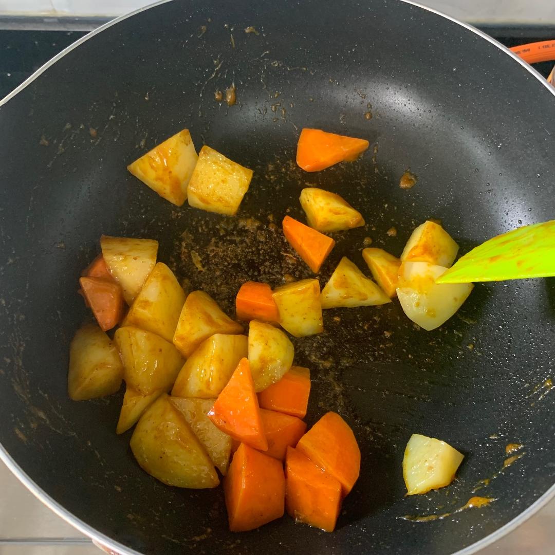 炒到土豆周围呈半透明的边就可以加入咖喱酱翻炒,咖喱酱分三次加,每次都是炒出香味后再加下一次酱