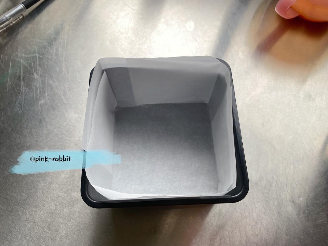 烤盘内铺入油纸。 ⚠️使用金盘专用28cm方形油纸特别方便。每边折起8.3cm即可。具体折法可参照《原味迷你古早》菜谱。
