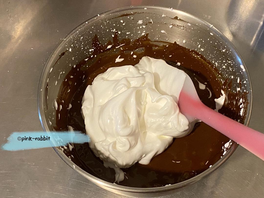 用手抽混匀,最后用刮刀整理盆边❗️拉上保鲜膜等待用。 ⚠️此时的巧克力蛋黄糊稀稠度一定是顺畅的连续下落的状态。