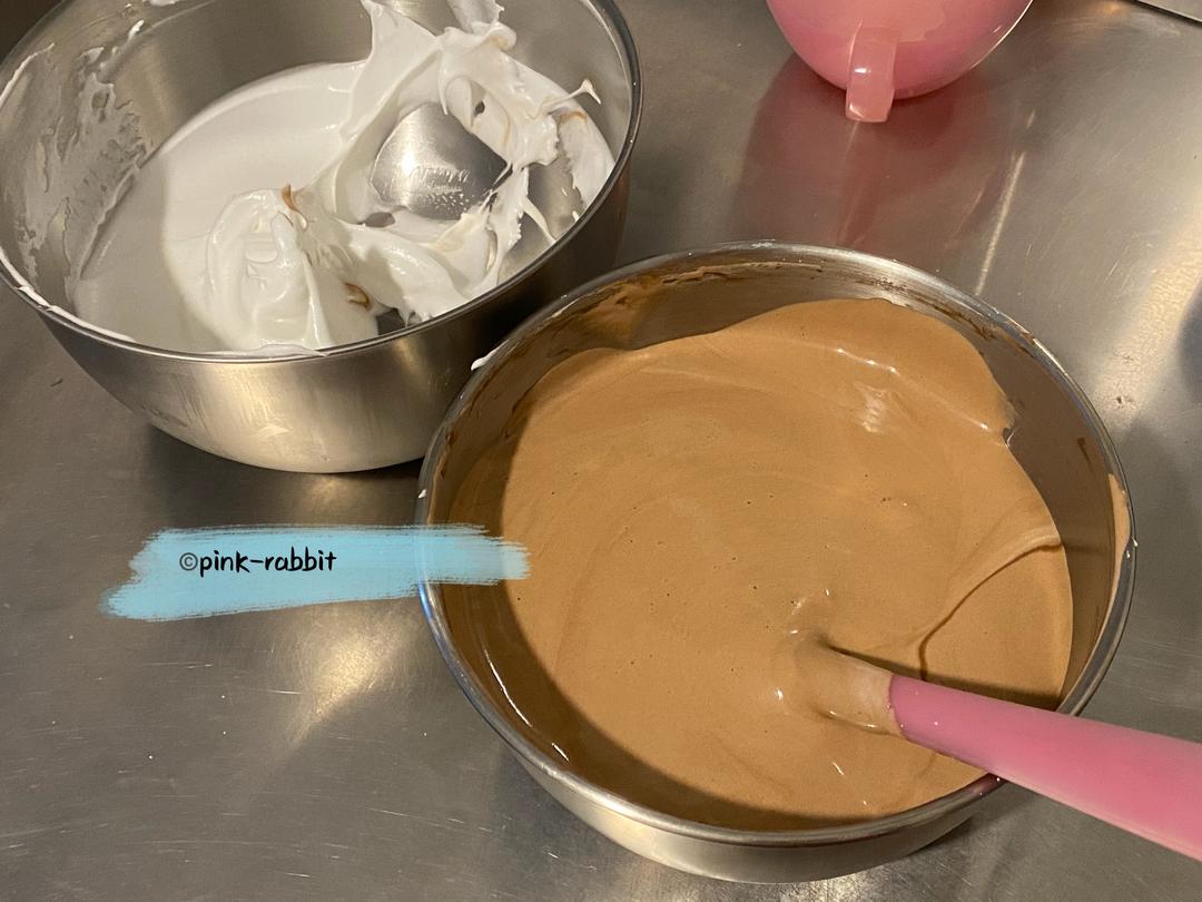 【操作流程】 1⃣️分离所需用量的蛋白于cotta大盆(内径22),称入{细砂糖+海盐+柠檬汁},用叉子稍作混匀,冷冻(-18℃)降温,设置40分钟定时。 2⃣️蛋黄+剩余蛋白 置于小碗,室温保存。注意密封。 3⃣️蛋白冷冻期间准备其他材料和工具。 ✔️ 裁剪油纸,铺入烤盘❗️ ✔️水浴烤盘加入自来水0.8-0.9cm深度。 ⚠️我的烤盘底面内径20*30,加水450-500g。 ✔️玉米油 称入cotta小盆(内径18cm)。 ✔️ {低粉+可可粉}称到同一个碗,拌匀。 ✔️牛奶、巧克力各自称入小碗,放置室温备用。 ✔️红外测温枪、电动打蛋器、手抽、刮刀2把。 ✔️烤箱调好预热温度、烤网调到倒数第二层。 ‼️蛋白冷冻40分钟后开始蛋糕糊操作。 4⃣️装有玉米油的不锈钢盆放到电磁炉600W加热至80℃样子,离火。 5⃣️倒入巧克力,搅拌至完全溶化。此时温度一般低于60℃,用电磁炉300W加热至65℃样子,离火。 6⃣️ 晃动油盆,使液体温度均一,再次确认油温在65-70℃范围后投入混匀的{低粉+可可粉},用手抽混匀。 ⚠️此时烫完的面糊一般45℃样子。 7⃣️ 一次性加入牛奶,用手抽搅匀。 ⚠️加入牛奶前先确认其温度,低于20℃的话,直接加入。高于20℃的话,等面糊冷却至40℃后再加入。 8⃣️ 一次性加入蛋黄,用手抽混匀,最后用刮刀整理盆边❗️拉上保鲜膜等待用。 ⚠️此时的巧克力蛋黄糊稀稠度一定是顺畅的连续下落的状态。