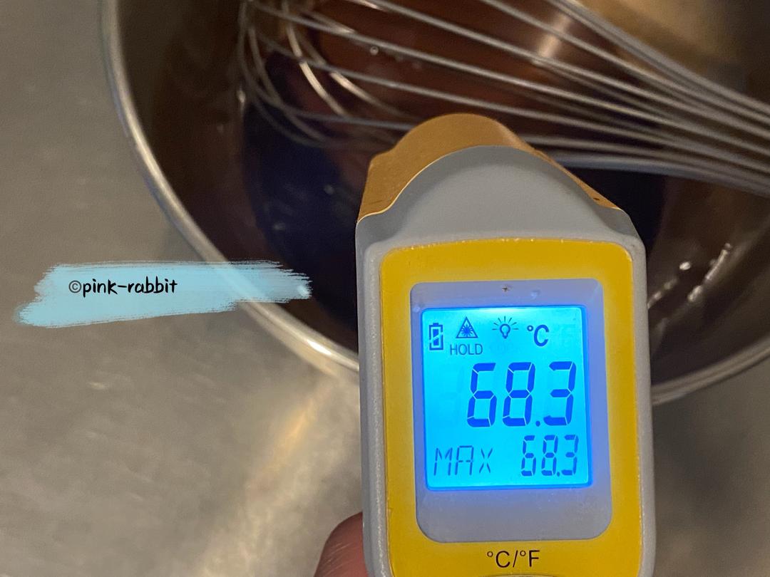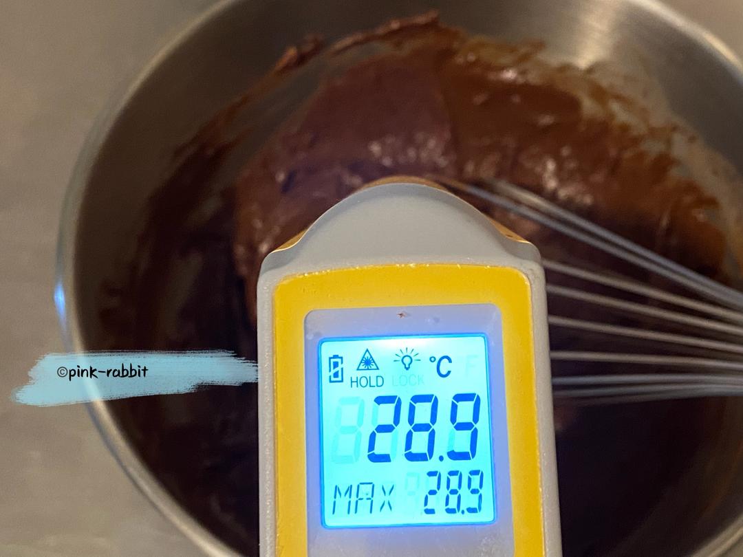 倒入巧克力,搅拌至完全溶化。此时温度一般低于60℃。