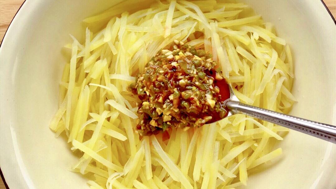 12、把烧椒酱和土豆丝搅拌均匀即可。