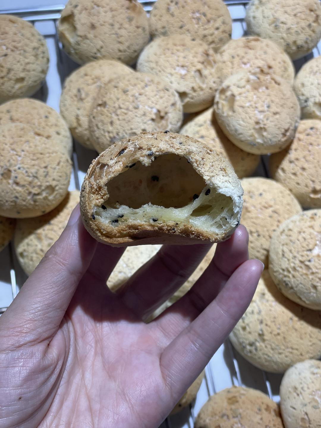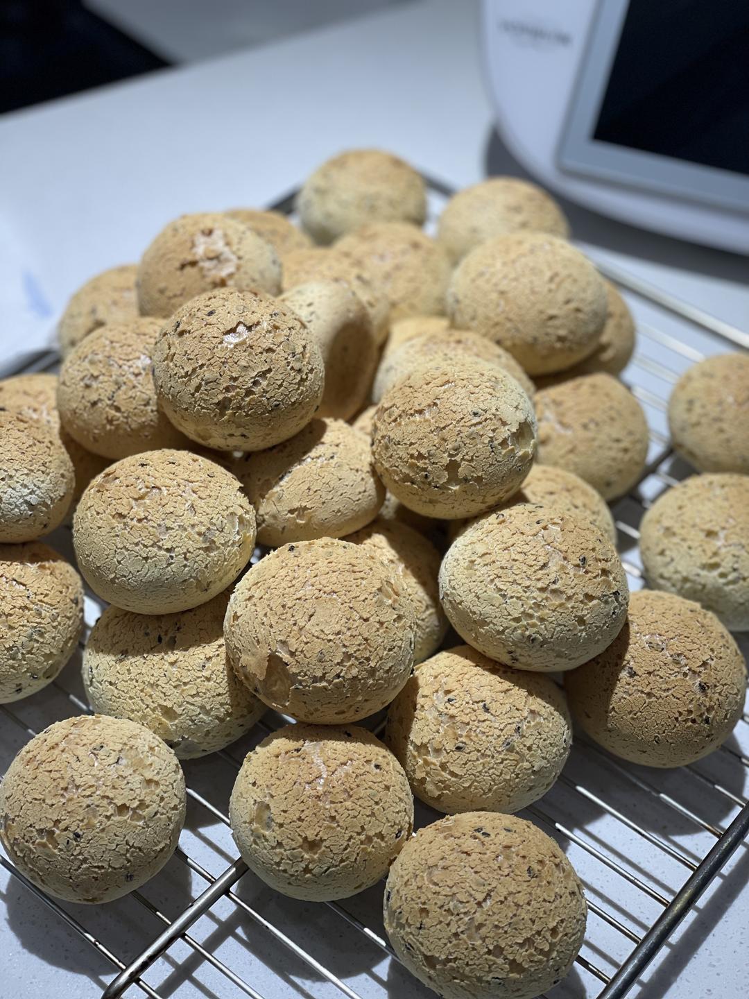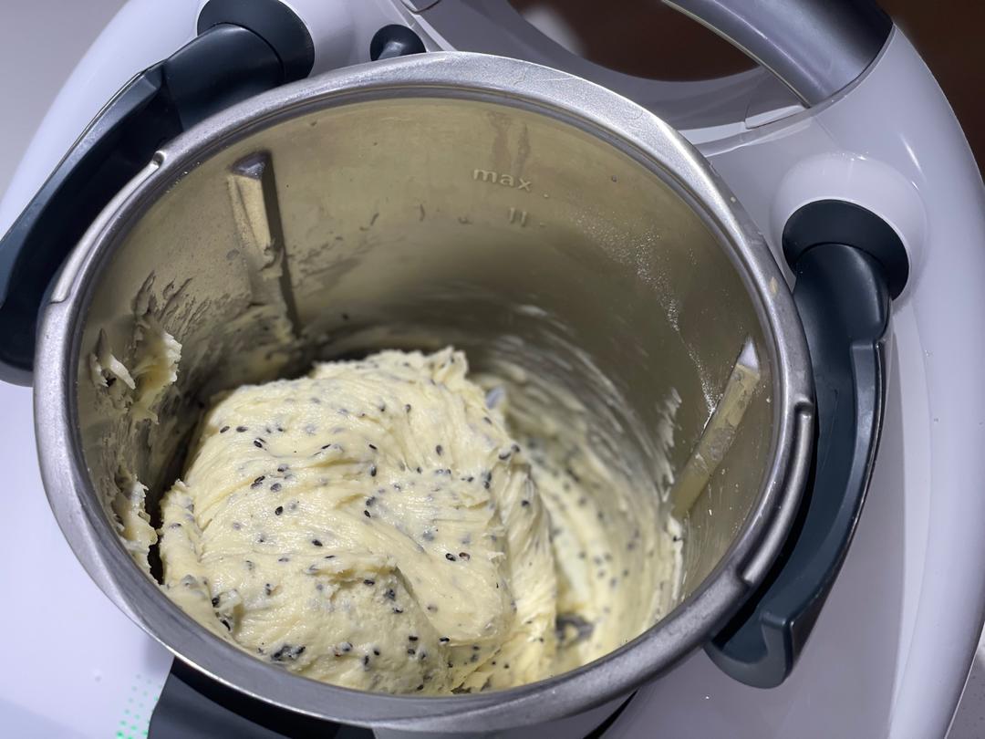 除了黑芝麻,所有材料入主锅 20秒 速度3到6。先混合 然后 揉面模式 30秒 加10克黑芝麻之后 再揉面模式 40秒 烤箱一定要最少提前十分钟预热 预热200度。 麻薯进去之后再调成 180度