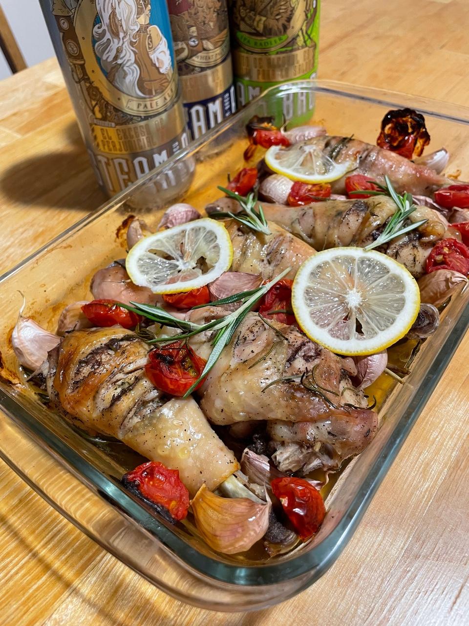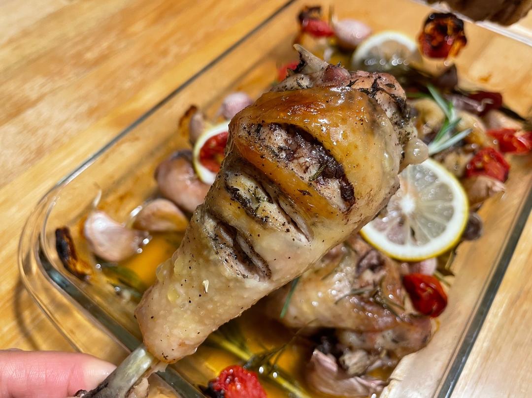 烤到一半时间就要多注意观察着,看见迷迭香和柠檬微焦也不要太担心,出炉的时候拿掉,不影响味道的。(实在不放心的可以降到200度,烤够时间哦,不然鸡腿不熟不要怪我),再过十分钟满屋就会非常香了~(不习惯迷迭香的会觉得味道有点奇怪,不用担心吃起来是香的!)