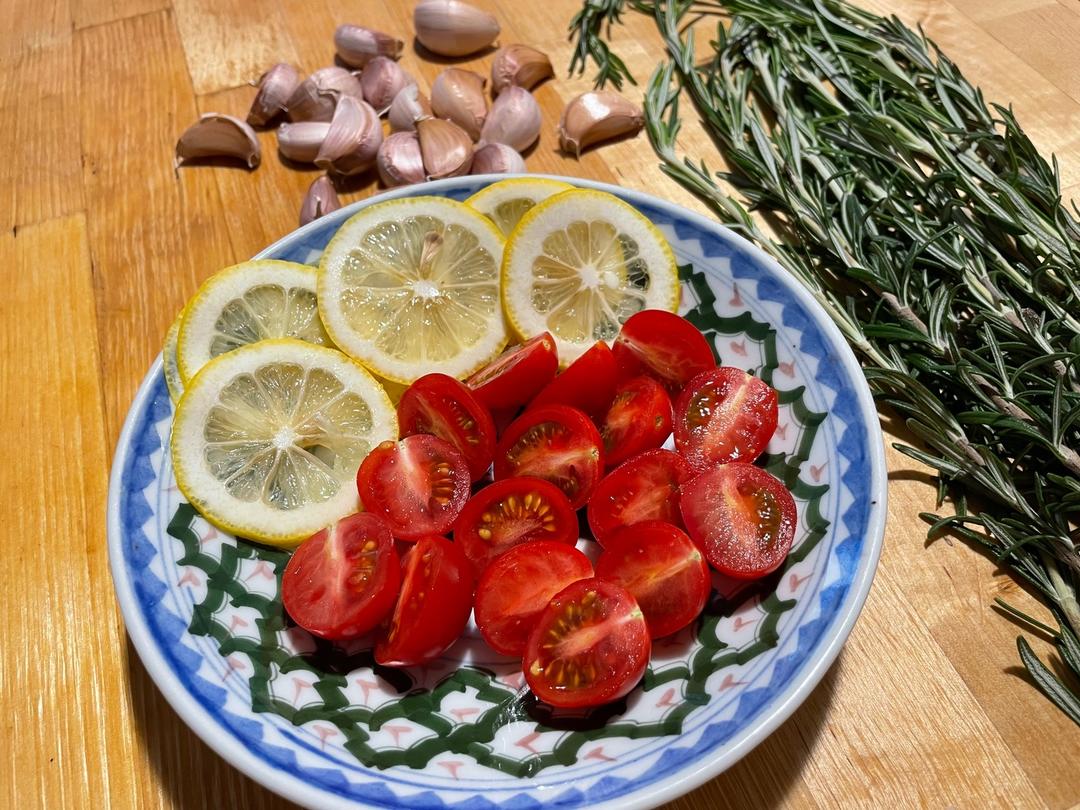 柠檬切薄片(考验刀工的时刻),圣女果一切两半,蒜头连皮(省事吧),迷迭香只要从中间截短点就行!