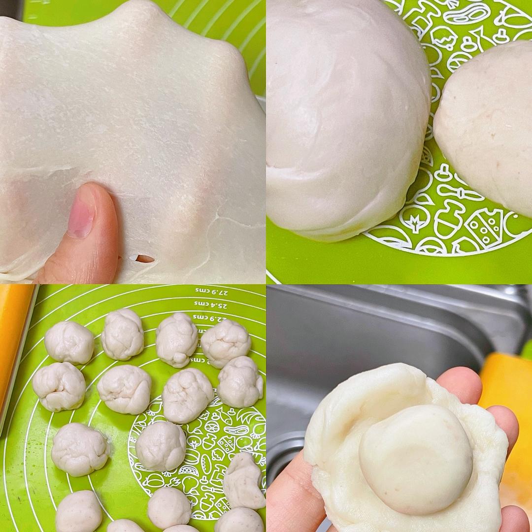 3️⃣:油皮.油酥均匀的的分成10个,一份油皮包一份油酥