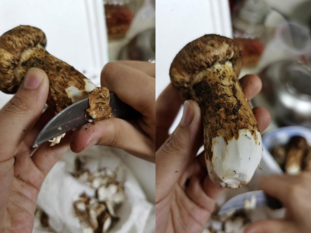 小刀把松茸的尾部,刮薄薄的一层,不要刮太多哦,主要是把松茸的根部,不好吃的地方刮掉