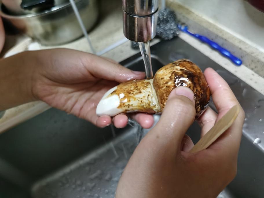 注意:1。把水切记要擦干哦,松茸是最好不要碰水的,但是没办法,不洗的话我心里上接受不了。擦干就行了。 2。松茸那个黑色的菌衣千万别洗掉哦!