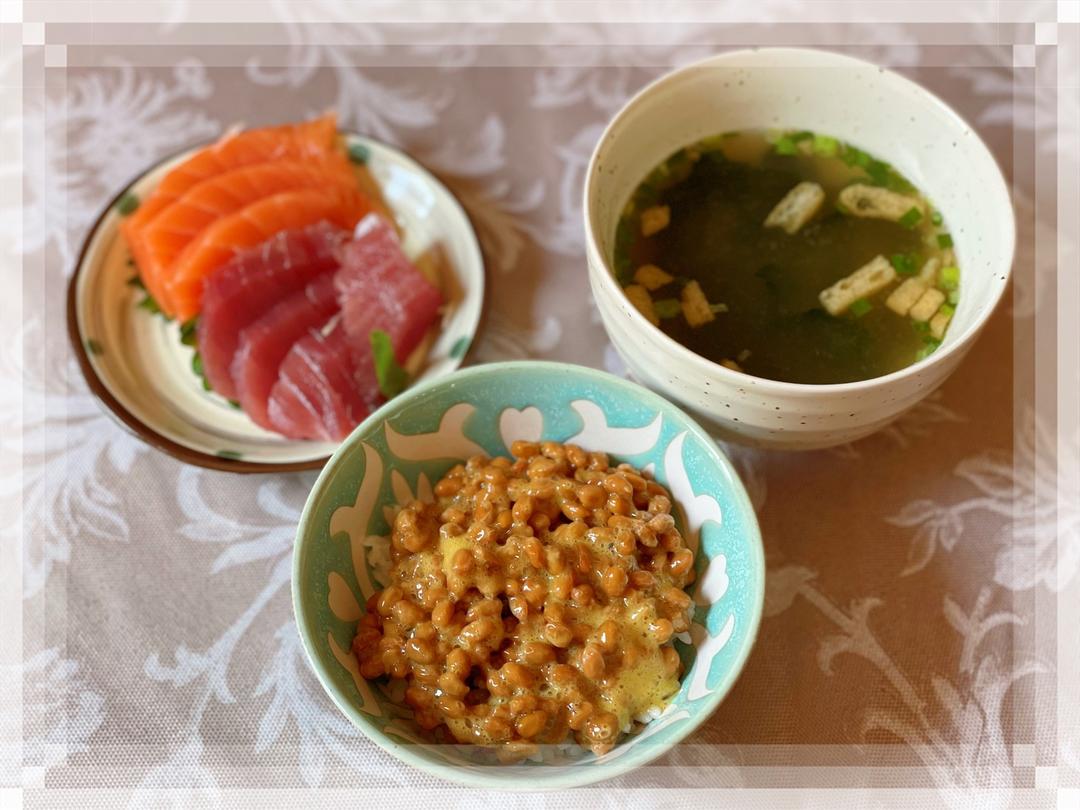 🔺第113道→ 纳豆盖饭/生鱼片/味噌汤 第一次尝试纳豆,味道倒没有什么不适,但并不喜欢粘粘乎乎会拉丝的感觉,听说是很有营养价值的食物。 生鱼片是昨天晚饭没吃完的,味噌汤是用开水冲泡的即食装,很方便。